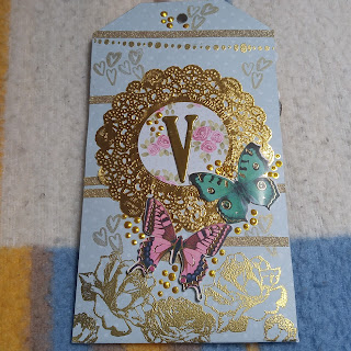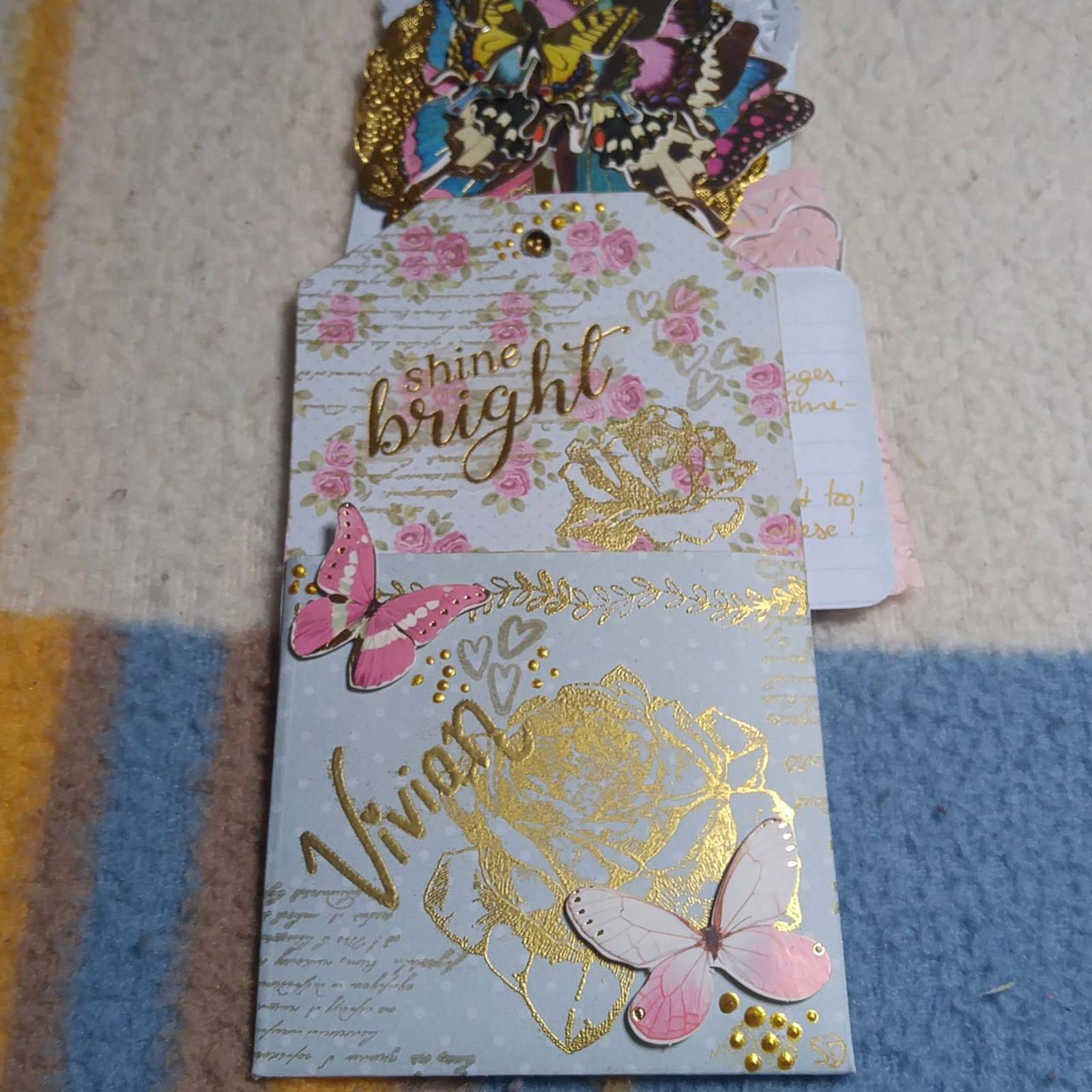 So this tag has the letter in it, that I wrote with a golden pen and some paper roses that I have been using (they're on my desk cause I will use them for another project, but I still need to order photos for that. I am pretty sure I have more of these flowers...) I didn't like the way the letter looked when I put it in and I decided to make a little envelope to put the letter in! That was one of the last things I did. That is why it has orange butterflies (I was out of the smaller pink ones... Yes, I got a new packages of these butterflies...) But the orange fits with the gold.